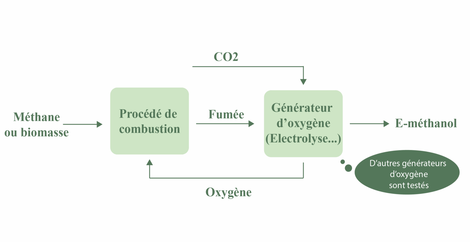 Description de la solution : Recyclage des fumées vers la chambre de combustion (oxy-combustion) intégrant un générateur d’oxygène consommant le CO2 provenant des fumées et produisant une molécule organique d’intérêt (exemple : méthanol, e-fuel…). Solution brevetée.